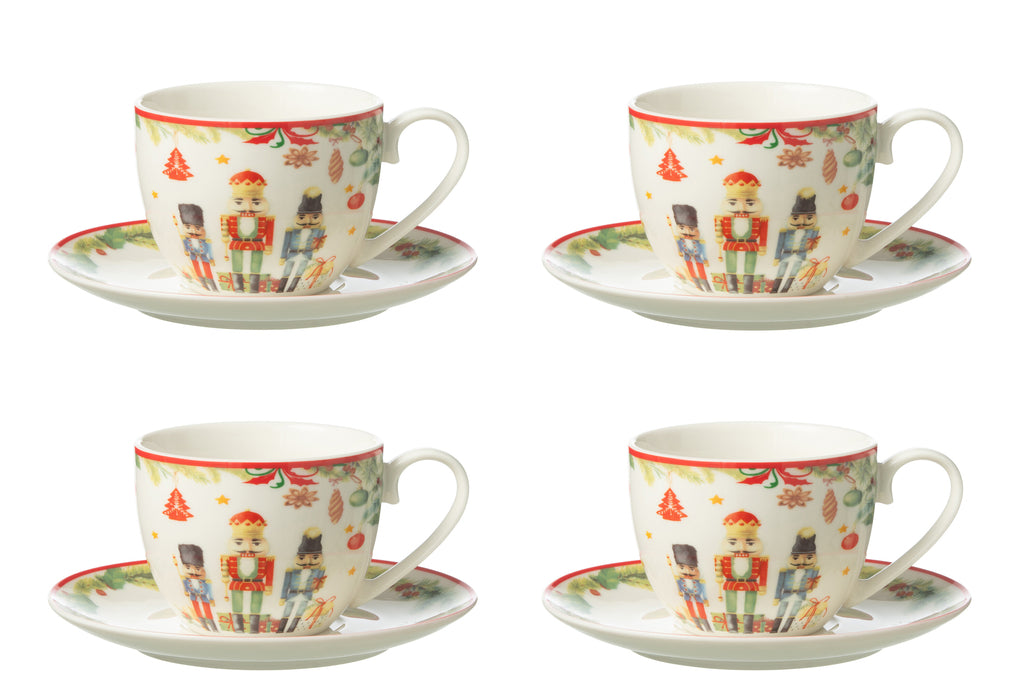 Doos met 4 theekopjes + schoteltjes Notenkraker Keramiek Wit