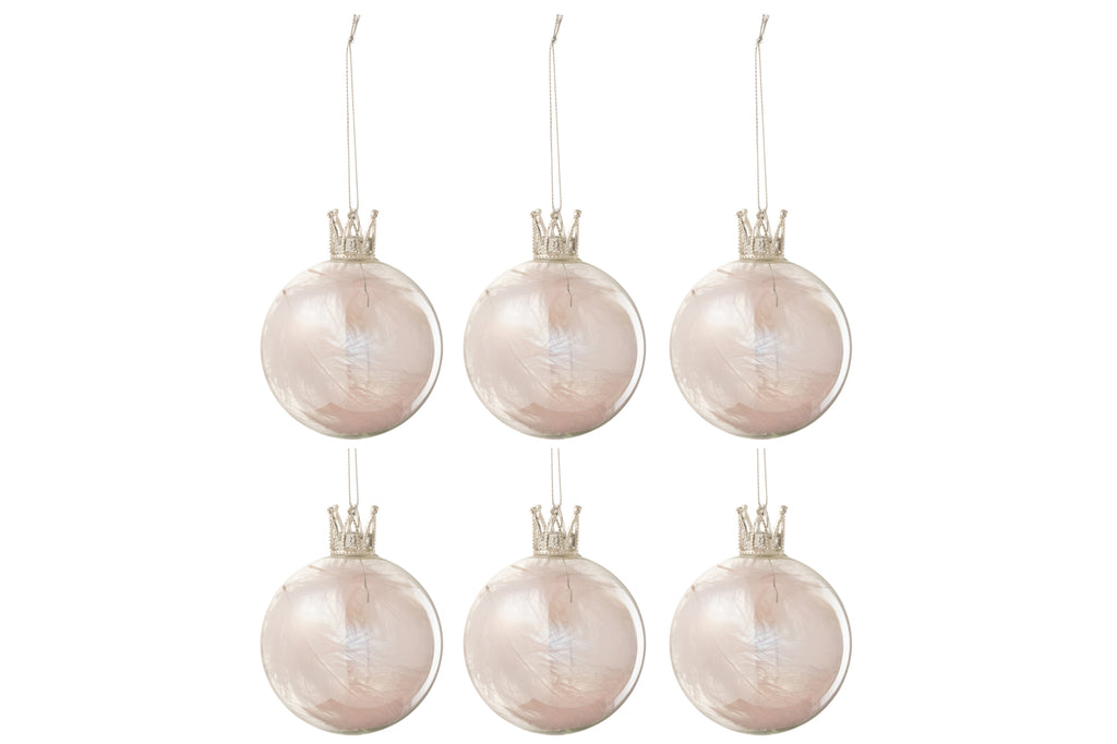 Doos met 6 kerstballen kroon veer lichtroze glas helder klein